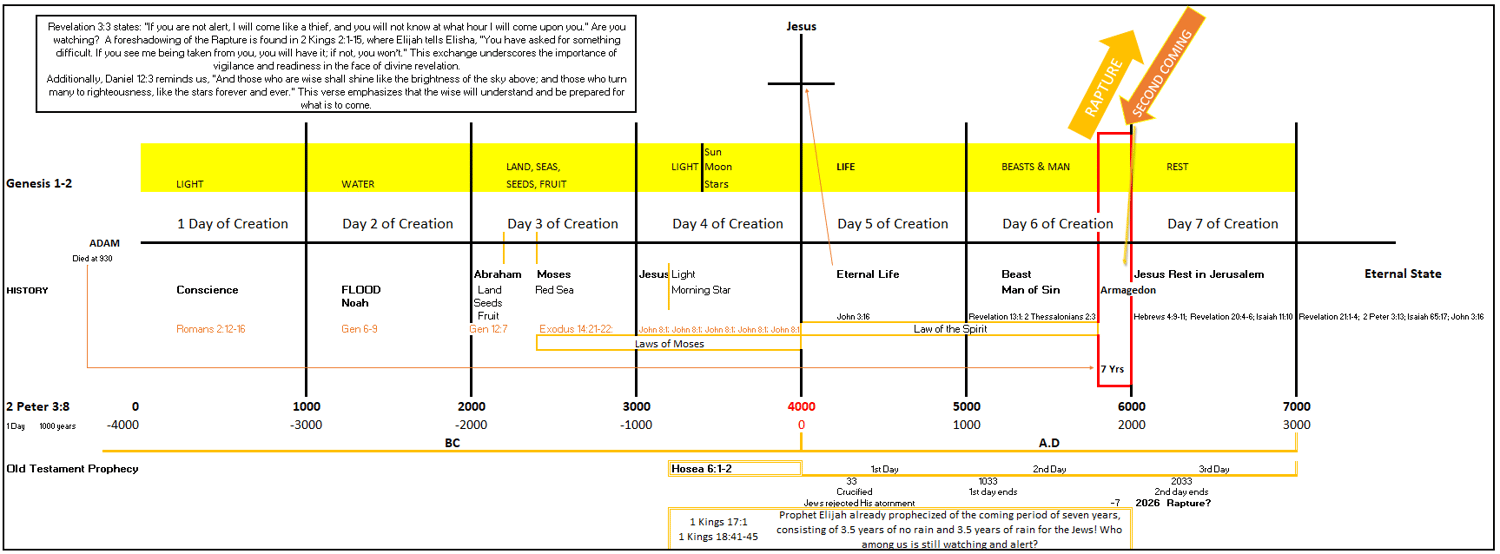 On the sixth day, He created beasts and humans, symbolizing the coming man of sin or beast of Revelation, expected in this sixth millennium. This man of sin will be the leading figure during the Tribulation, as described in 2 Thessalonians 2:3-4, where he is depicted as exalting himself and opposing everything that is of God. This intricate design is not coincidence but reflects God's intelligent plan. The Scripture highlights that this period of seven years, often referred to as the Tribulation, is divided into two phases of 3.5 years each (Daniel 9:27; Revelation 11:2-3). Elijah's prophecy of three and a half years of drought (1 Kings 17:1), symbolizing the absence of the Holy Spirit, is followed by three and a half years of rain (1 Kings 18:41-45), representing the Lord's turning back to the Jews and giving them the Holy Spirit. This prophetic parallel underscores the spiritual significance of this period in understanding the culmination of God's redemptive plan for humanity, as it aligns with the judgment and restoration described in the book of Revelation. However, the Rapture is believed to precede this period, as it serves to protect the Church from the wrath of God that will be poured out during the Tribulation (1 Thessalonians 1:10; Revelation 3:10).
